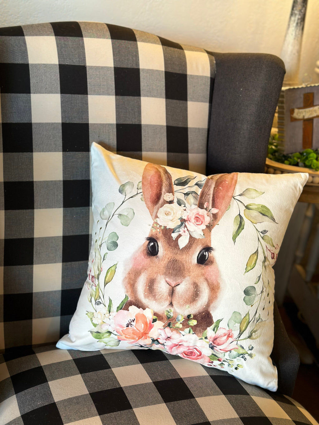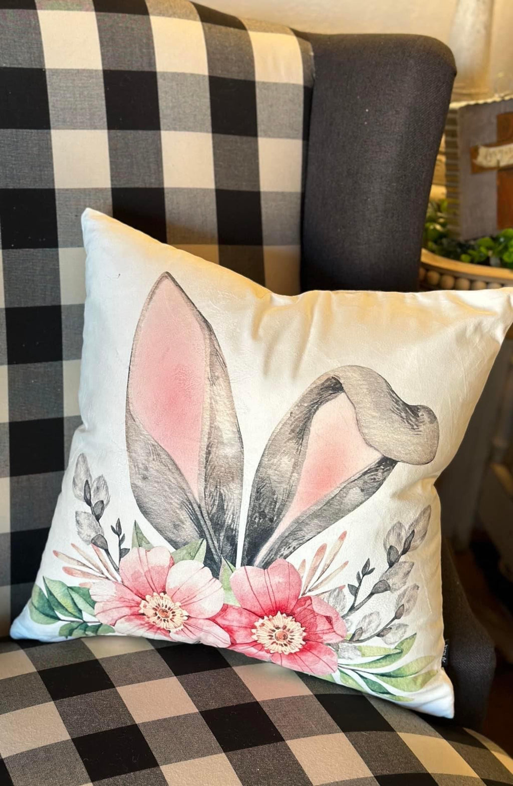 Velvet Soft Bunny Ears Pillow w/ Pink Flowers