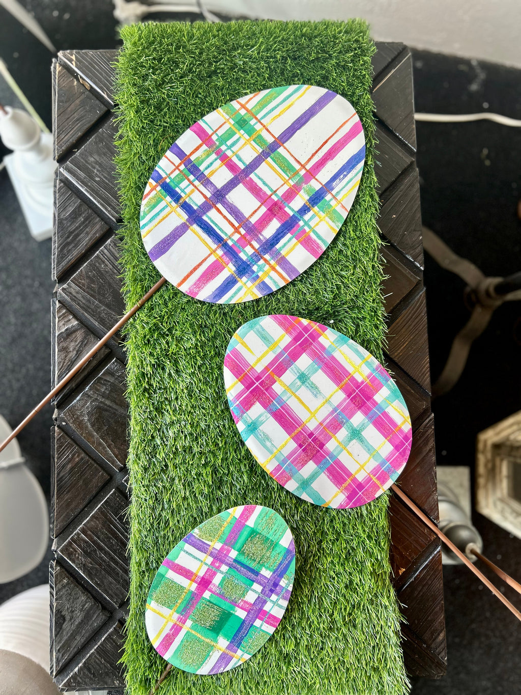 Plaid Metal Eggs Set of 3 Outdoor Stakes in Pink, White and Blue