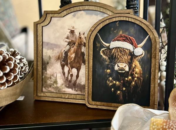 This unique 6x8" Arch Top artwork is printed onto canvas using high quality Canon pigment inks. The canvas is then mounted onto a wood backer. This piece has a double layered wood frame stained in a neutral Early American tone. This piece can be hung on a wall using an adhesive strip or it can sit on a shelf, the size is nice for a tiered tray, or sitting on an easel.
