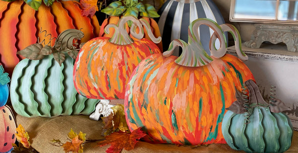 Set of 2 Artful Metal Pumpkins Colorful tones of orange, green, and yellow