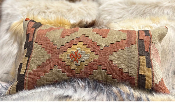 Aztec Kilim Pillow in 12”x20” in Dark Terra Cotta, Brown, Cream, Gold