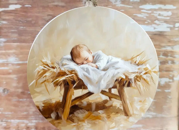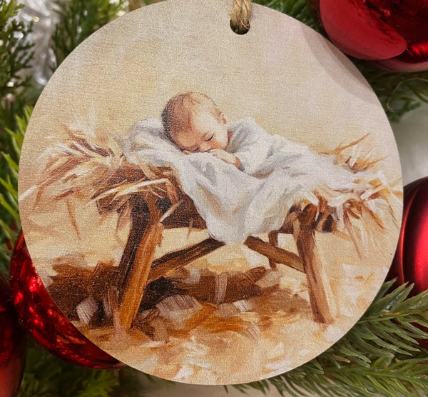 Bring the true meaning of Christmas into your home with this precious picture of Baby Jesus in manger 4” ornament, backside solid wood.