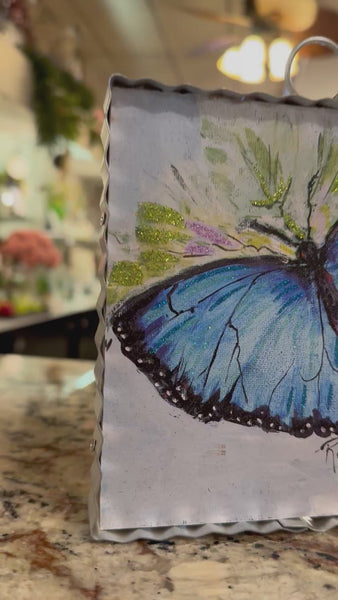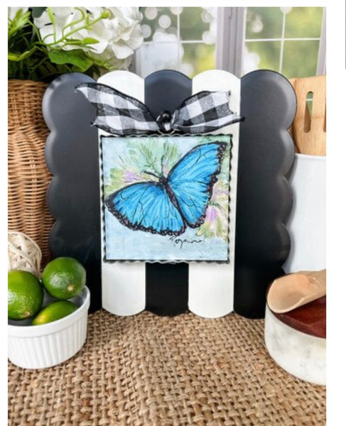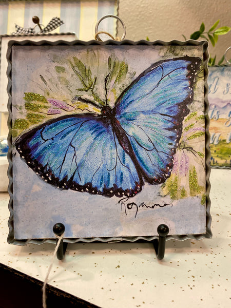 Our galvanized frame small pic with a beautiful blue butterfly! You can place this in a wreath, set it on a tiered tray or shelf, place it in one of our stands!
