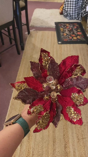 This stunning Burgundy Poinsettia and gold is perfect for an arrangement, in your tree or wreath! The velvet and sequins are stunning on this poinsettia.