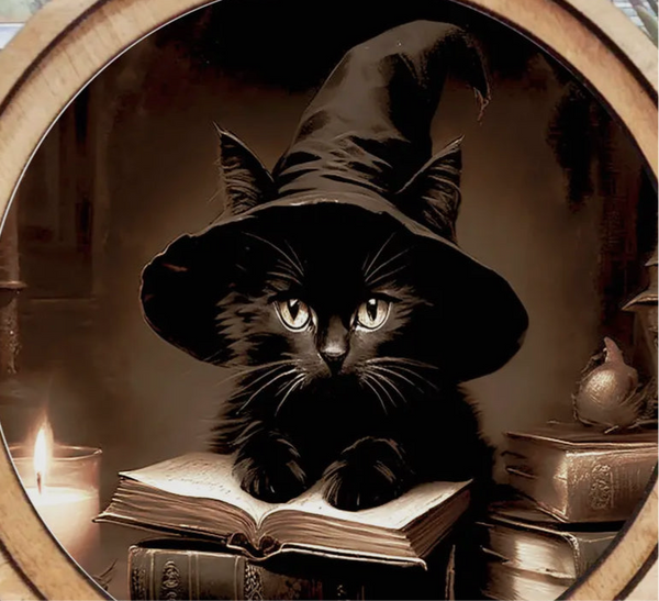 Add a touch of spooky charm to your seasonal decor with this 8”x8” artwork featuring a black cat wearing a classic witch hat, sitting beside a spell book. Perfect for Halloween displays, tiered trays, shelves, or entryway tables, this piece brings a playful yet mysterious vibe to your home. Ideal for cat lovers and witchy decor enthusiasts alike.