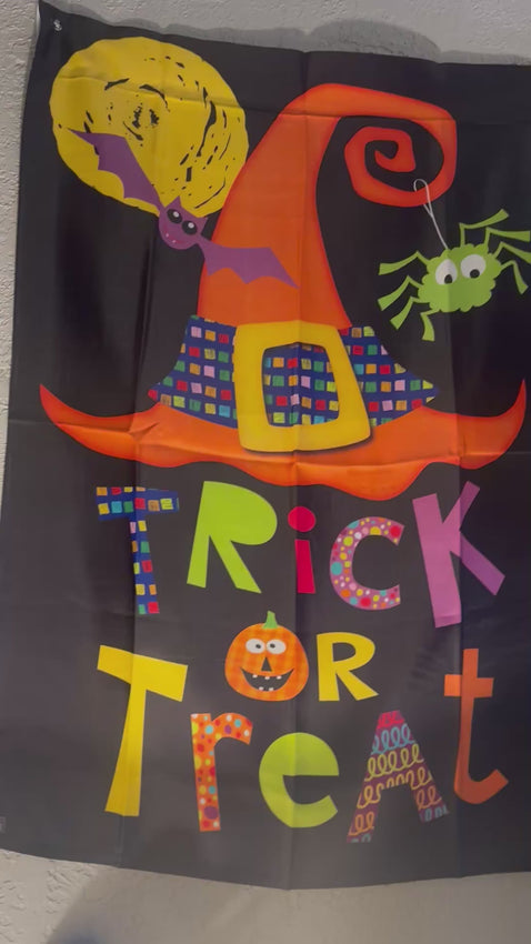 Large Black Trick or Treat Flag Outdoor with Witch’s Hat, Bat, and Spider