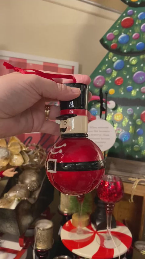 This Nutcracker Bell Ornament is adorable in a shiny finish, rings, and has a red satin ribbon to hang.