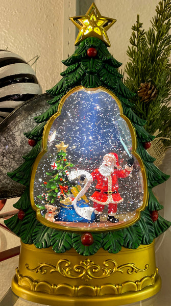 Special Christmas Vibe - Made from premium resin and acrylic, the snow globe lantern is overall in the shape of a Christmas tree, the Santa Claus stands next to the tree with good list on hand, ready to hand out gifts in his gift bag. As the electric snow globe lights up, the glittering sequins rotates, creating an enchanting Christmas atmosphere.