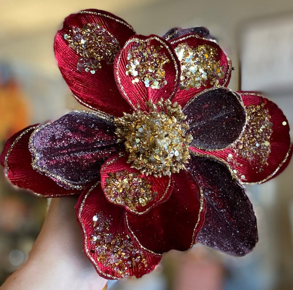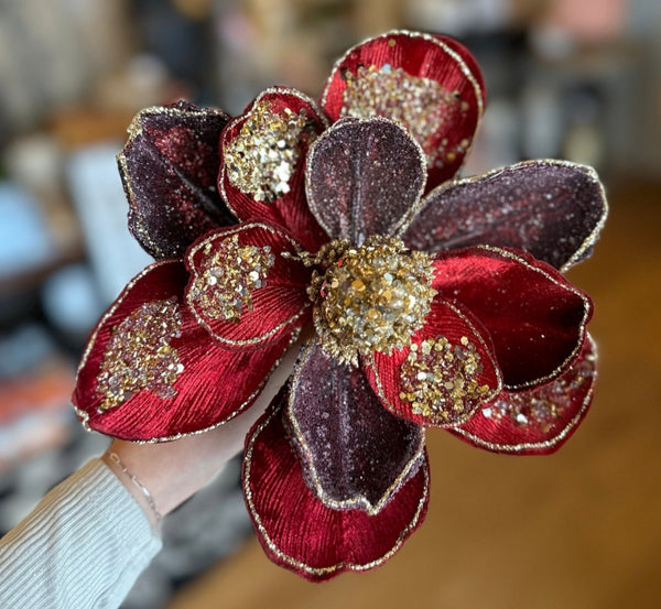 This stunning Burgundy Magnolia and gold is perfect for an arrangement, in your tree or wreath! The velvet and sequins are stunning on this magnolia.