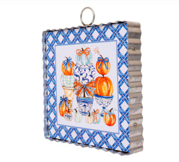 Blue and White Lattice Border with Orange Pumpkins Mini Print with Galvanized Frame
