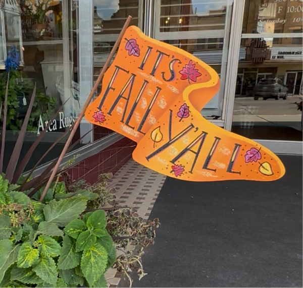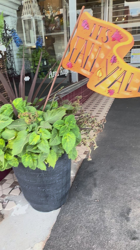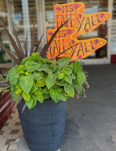 This Orange Metal Fall Flag is great displayed in an arrangement, pot of mums, greenery, or flower bed outdoors! Add to a wreath!