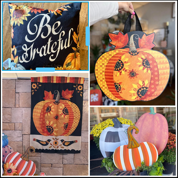 Fall Pumpkin Primitive Pattern Door Hanger with Chocolate Ribbon Hanger