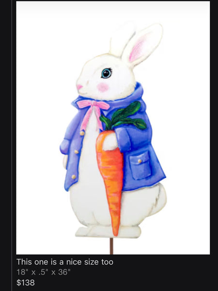 The Peter Rabbit with carrot in hand, his periwinkle and pink jacket is ready for the easter season! He is adorable placed in one of our base holders, stake in the yard, or a pot on the porch!