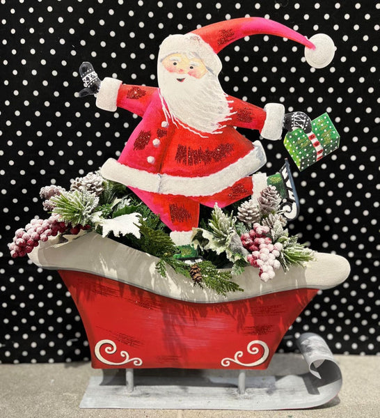 This adorable Metal Red Sleigh sets on its own and can pair with other standing stakes for a display, or create your own with adding foam in the pocket, add greenery, florals, and stakes!