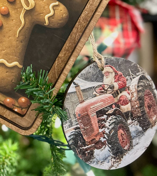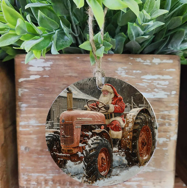 Celebrate the holidays with this charming 4” wood ornament featuring Santa on a tractor. Perfect for adding a festive touch to your home decor.