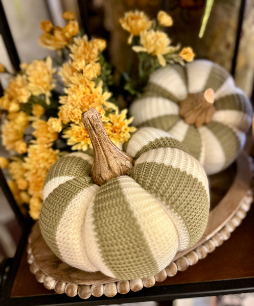 This detailed Knit Khaki & Cream Pumpkin has a unique pattern with the wavy pattern. This is great to add to a table, dough bowl, or mantle.