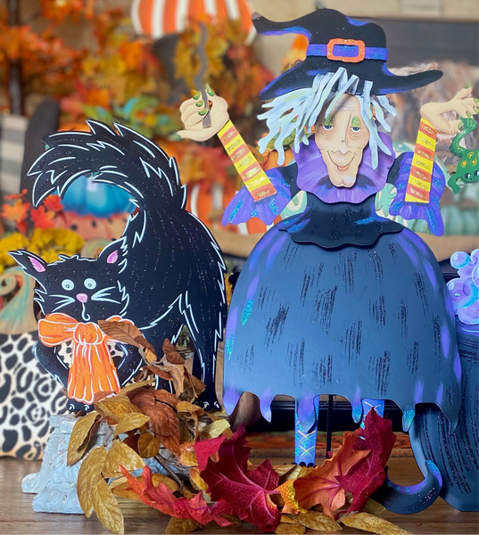 This new addition to the Tillie collection Small Tillie with Easel Back in purple and black, yellow and orange stripe sleeves, Metal Stake with her holding a green frog. Great for your porch, flower bed or entry in your house! Display outdoors or use inside for a creative and fun display!