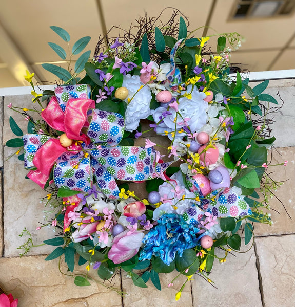 Beautiful blooms in soft pinks, whites, purples, and blues are layered among natural twig elements and fresh greenery, giving the wreath wonderful depth and texture. A whimsical ribbon with colorful Easter eggs paired with a bright pink accent bow adds a fun and festive touch, making this piece perfect for the Easter season.
