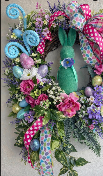 Spring/Sumner Teal Bunny Wreath with Pink Roses, Pink, Green, Yellow, Blue Colors and Easter Eggs